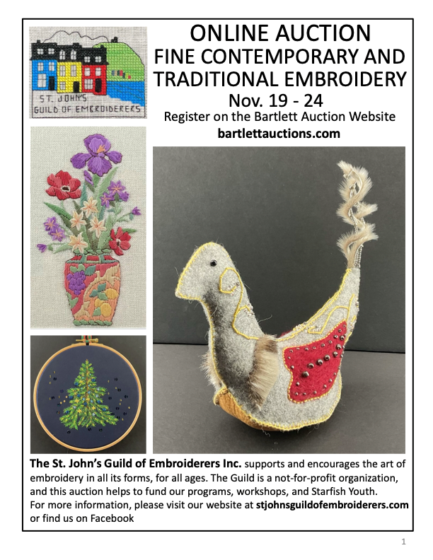 We encourage you to view the exquisite work of the St. John’s Guild of Embroiderers, fall in love with these treasures, and take them home or give them to someone special as a gift. You can preview them online at Bartlett Auction House, or in-person at their location on the 7th floor, Atlantic Place.